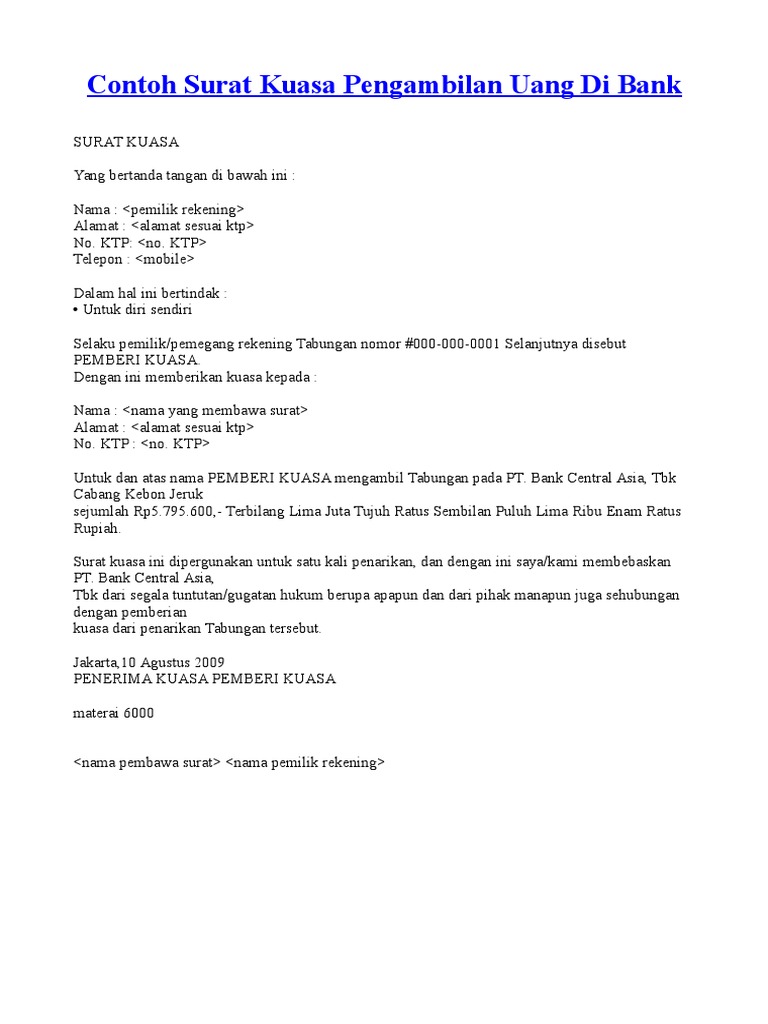 Contoh Surat Kuasa Pengambilan Uang Di Bank Bca Bni