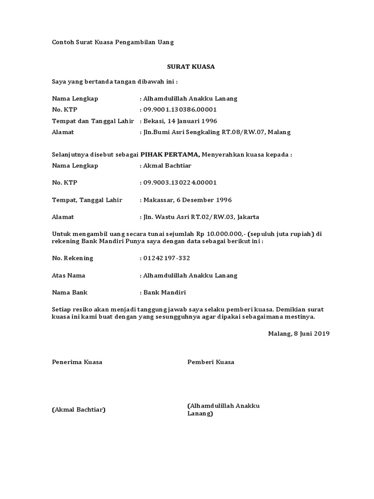 Contoh surat kuasa pengambilan uang. 29 contoh surat kuasa berbagai keperluan yang benar surat kuasa pengertian fungsi macam unsur gurupendidikancom untuk pembahasan kali ini kami akan mengulas mengenai surat kuasa yang dimana dalam hal ini meliputi pengertian fungsi macam dan unsur nah agar lebih dapat memahami dan dimengerti simak ulasan selengkapnya dibawah ini. Untuk selanjutnya disebut sebagai pihak kedua dengan adanya surat kuasa ini untuk sewaktu waktu bertindak atas nama pihak pertama kepada pihak kedua melakukan pengambilan paspor dengan id 1ahdurh678438 di kantor imigrasi kelas 1 khusus jakarta selatan yang beralamat di jl. Yang akan kita bahas pada kesempatan kali ini adalah mengenai contoh surat kuasa pengambilan uang di bank.