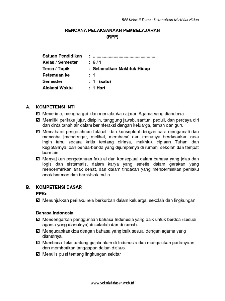 1 Rpp Sd Kelas 6 Semester 1 Selamatkan Makhluk