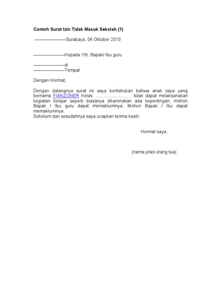 Namun yang penting memang harus di perhatikan misalkan saja dalam hal penggunaan bahasa dimana memang surat izin tidak masuk sekolah ini masuk dalam surat resmi maka usahkan gunakan bahasa yang baik dan sopan jangan menggunakan singkatan atau berbelit belit. Oleh karena itu jika kalian sedang sakit dan tidak bisa mengikuti pelajaran yang ada di sekolah kalian dapat mengirimkan surat izin kepada pihak sekolah yang bersangkutan. Informasi tentang contoh surat izin tidak masuk sekolah karena sakit atau halangan lain tidak masuk kerja tidak masuk kuliah surat izin dari orang tua surat izin untuk kegiatan peminjaman tempat dsb.
