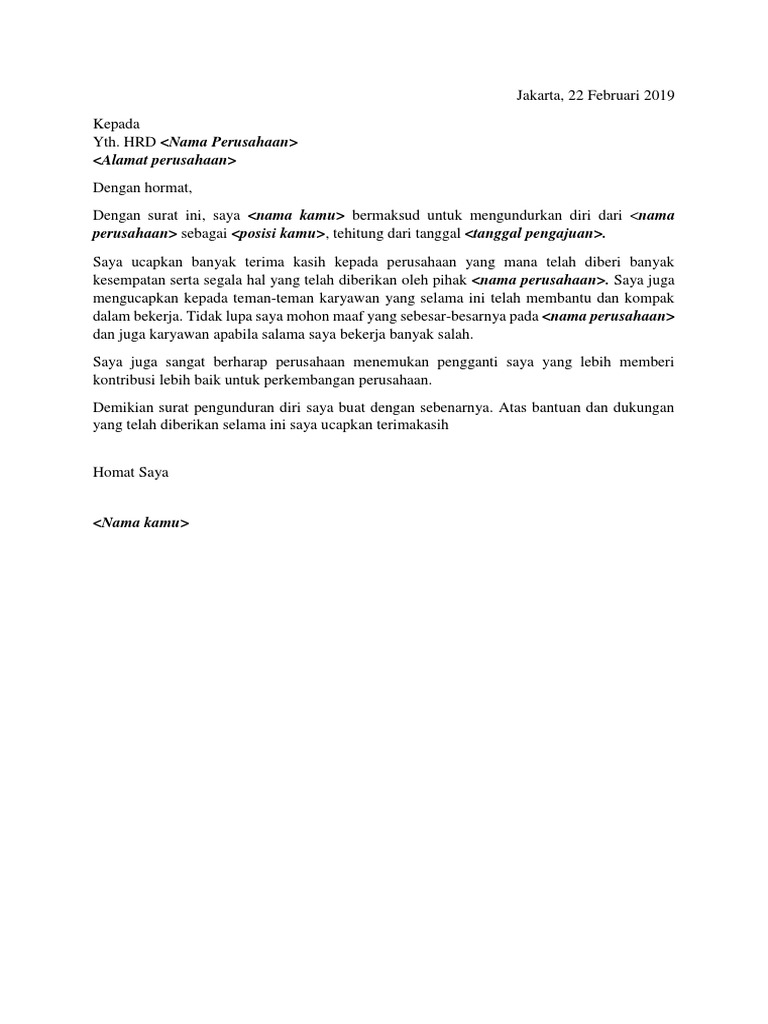Contoh surat pengunduran diri dari perusahaan. 3 contoh surat pengunduran diri kerja dalam bahasa inggris dan artinya ada banyak sekali alasan dari seseorang ketika keluar dari sebuah perusahaan seperti tidak betah lagi karena persaingan yang. Satu hal yang paling ditakuti oleh seorang karyawan pasti pemutusan kerja dari pimpinan perusahaan namun adakalanya seorang karyawan yang sangat disenangi oleh pimpinannya malah. Identitas diri jabatan alasan pengunduran diri keluar dari perusahaan tanggung jawab pekerjaan opsional permohonan maaf dan ucapan sukses untuk perusahaan.