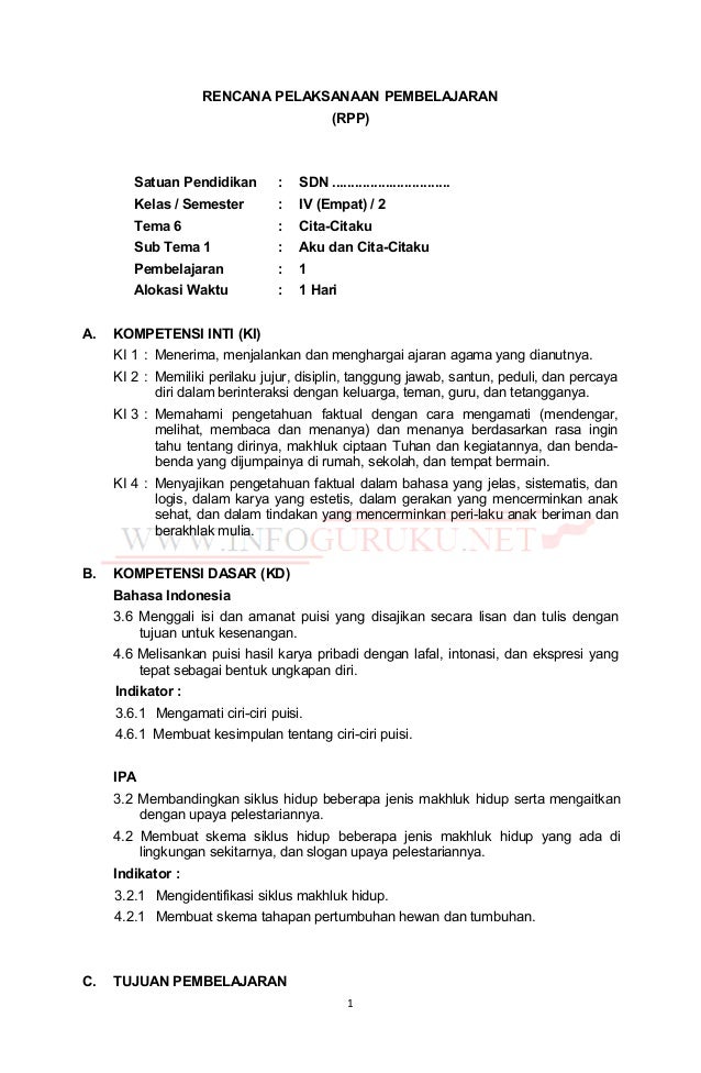 Rpp K13 Kelas 4 Semester 2 Revisi 2017 Tema 6 Cita Citaku